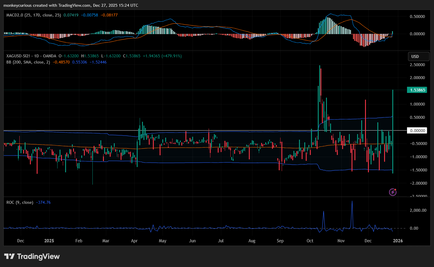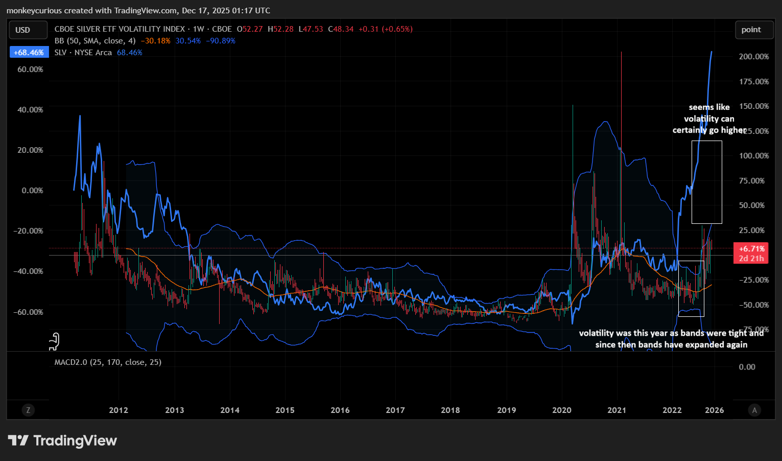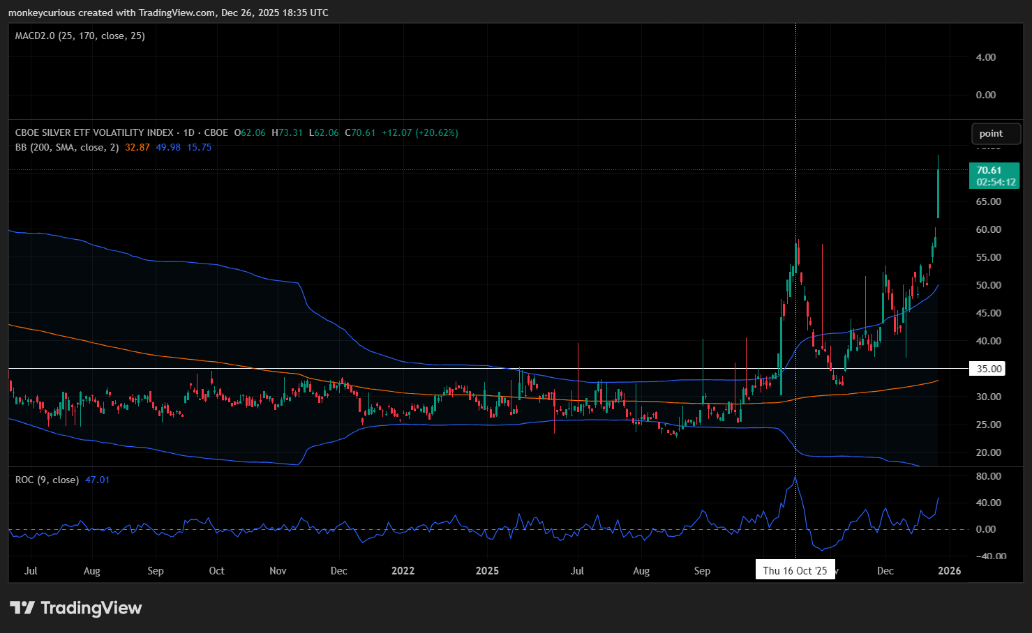 One thing I know for certain is that the rally will be harder to trade as volatility increases. I've attached the CBOE Silver ETFVolatility index, which based on historical comparisons, seems to show that the volatility can go higher. You've probably read on X that there's a tug of war going on between physical buyers vs. futures contract buyers. If things get unruly there, backwardation, issues with the SLV ETF itself, and things like that occur (backwardation occurred early October, the Silver spot - SI futures chart) and that increases volatility, along with big upward movements in price.