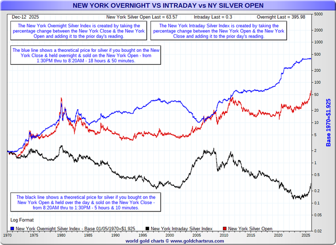 I'm watching Silver tonight too, gold/silver ratio now at 65. There's an interesting chart that's been making the rounds on X and it's from a precious metals bug website and posted by James Anderson from SD Bullion. It shows the overnight silver price index and an intraday silver price index (during USA trading hours). In looking at this chart it is apparent that silver tends to peak when the red line and the blue line converges. The only problem is that the blue line is close to $400 and the red line is in the $60s . So just with this chart alone, it tends to favor the odds that there's more to go in the coming months (years?). Besides that, silver just broke out of that 45 year cup and handle that Matt has been showing. And you know the adage, "the bigger the base, the higher in space."