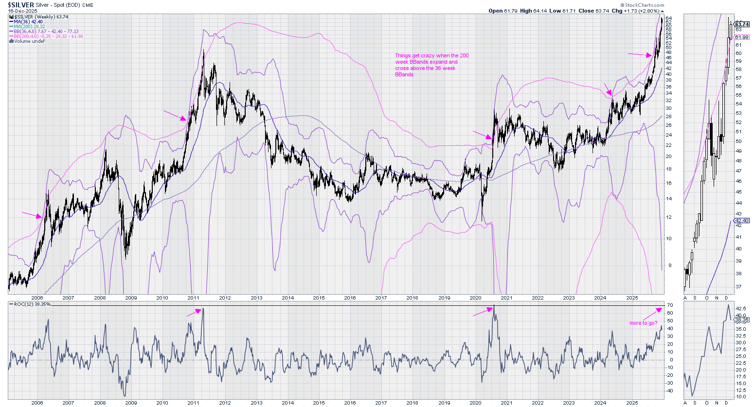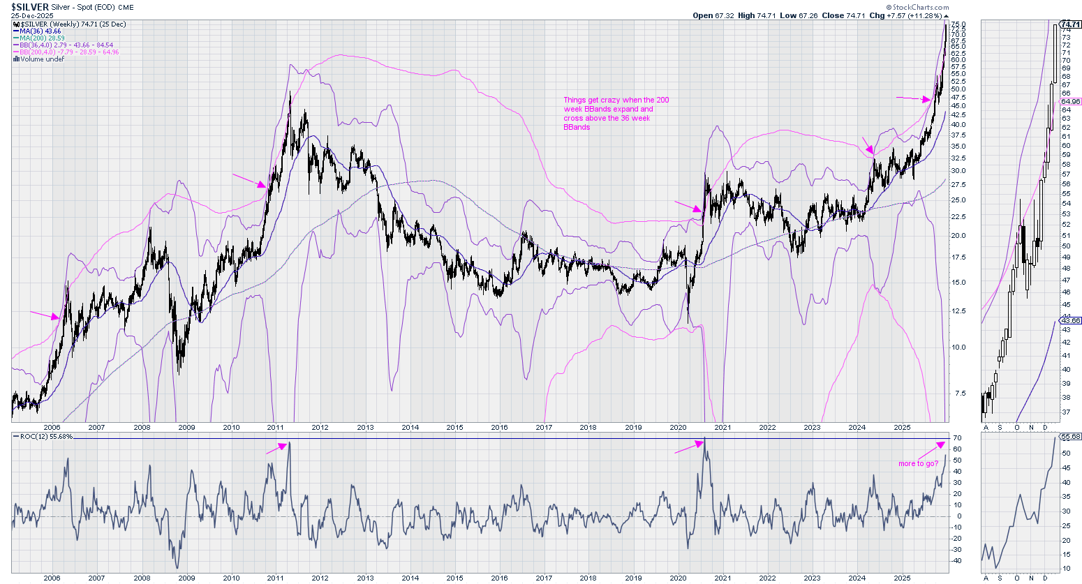 And just for fun I made this Weekly chart showing how stretched Silver can get. It has 36 Week Bollinger Bands and 200 Week Bollinger Bands. I've marked instances in the past when the 200 Week bands cross above the 36 Week bands and things get wild. The cross recently happened at silver price $47. Right now the 4 std. deviation level is $77 on the 36 Week Bollinger Bands (it tagged 4 std. deviations in 2020). The rate of change (ROC) on that chart hints it can go higher.
