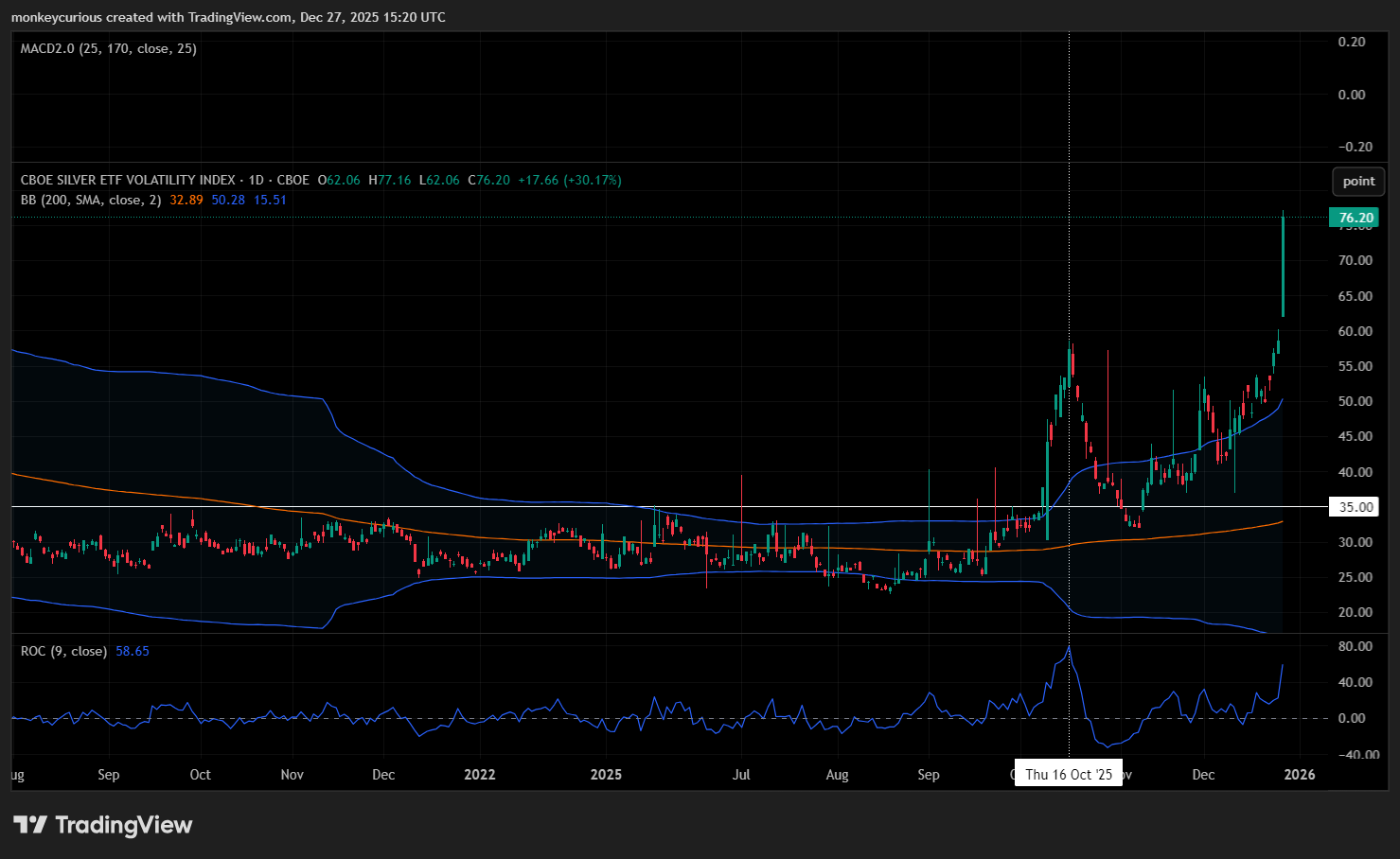 CBOE Silver ETFVolatility index chart up 20% today. Also, my Weekly Silver "goes crazy" chart showing $85 as 4 std. deviations above the 36 wma. And ROC now at 55 (will it tag 70 soon?).