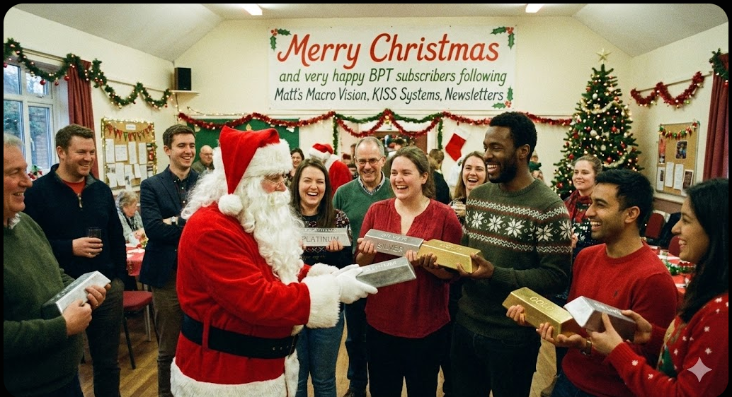 We all must strive to stay humble, especially with trading. That said, I had some amazing calls this year with Matt's Macro Vision Swing plays and I'm happy that many of you partook in these ideas! KISS systems, while we had some bugs along the way, have done very well too. Plus newsletters and trade ideas good too. Here's a dumb AI image showing Santa handing out Platinum, Silver, and Gold bars LOL