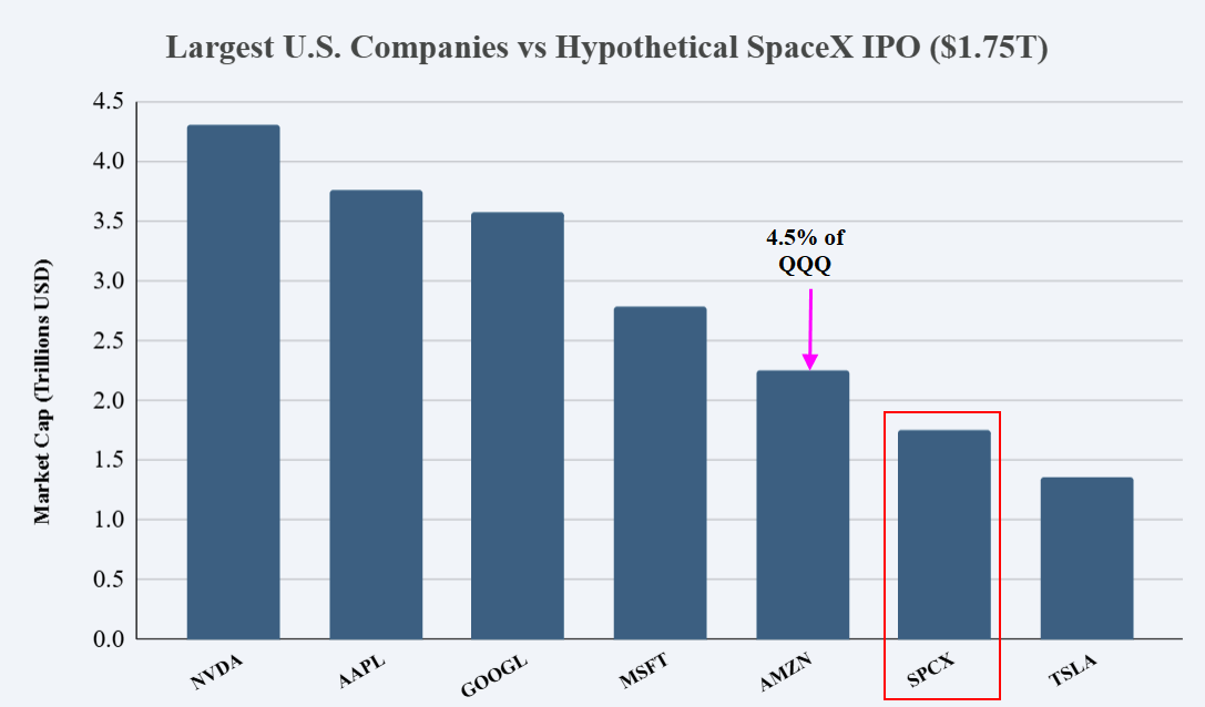 also, the Nasdaq is changing its rules, which I don't agree with but will have reaching effects. The way it's been is that when stocks go IPO, it's about a year before they can get accepted into the Nasdaq 100 or S&P 500. That's so that enough time occurs to allow 'price discovery' Because as you know, once something is in the Nasdaq 100, a bunch of funds and ETF's have to buy it. Nasdaq changed their rules for SpaceX so to only 15 days!!