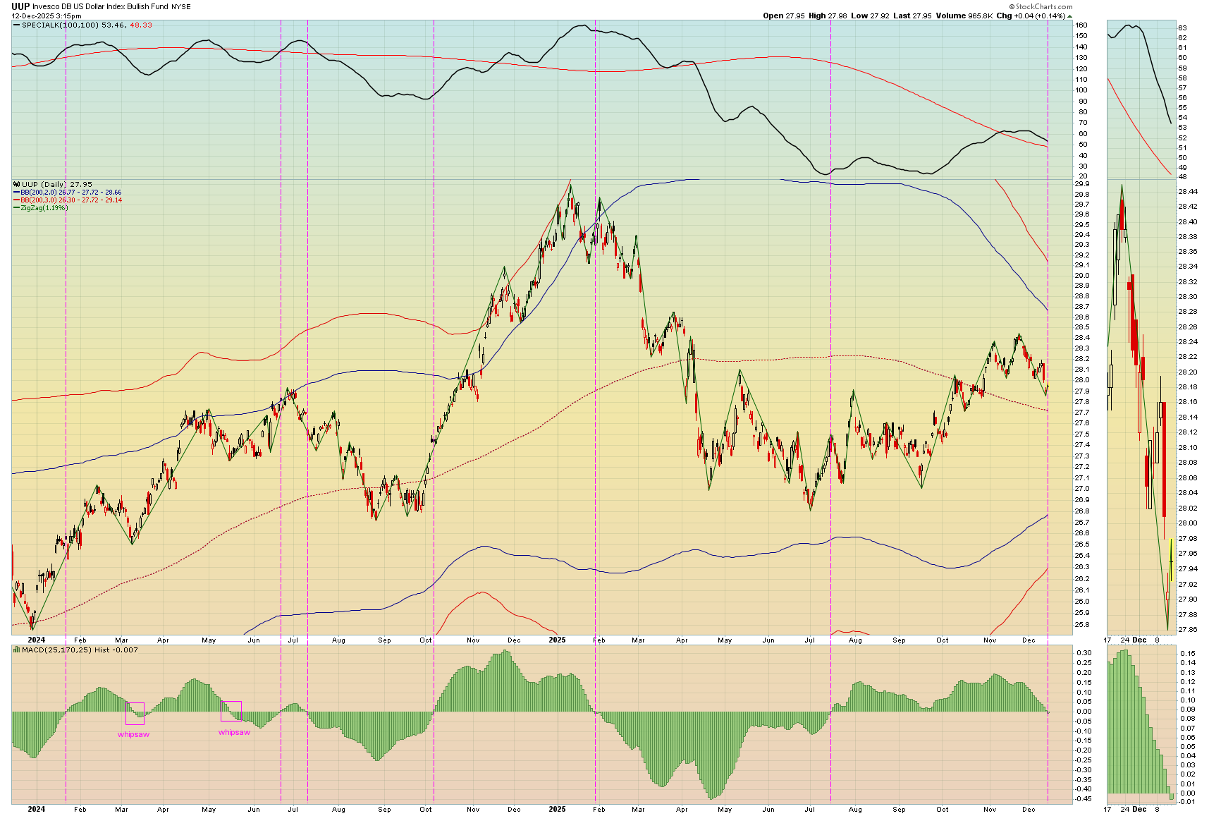 This 25/170/25 setting works on other securities (not all) as well, for example, UUP, the US Dollar. In fact it is going negative today. The attached chart shows how clearly the intermediate-term trends can be seen.