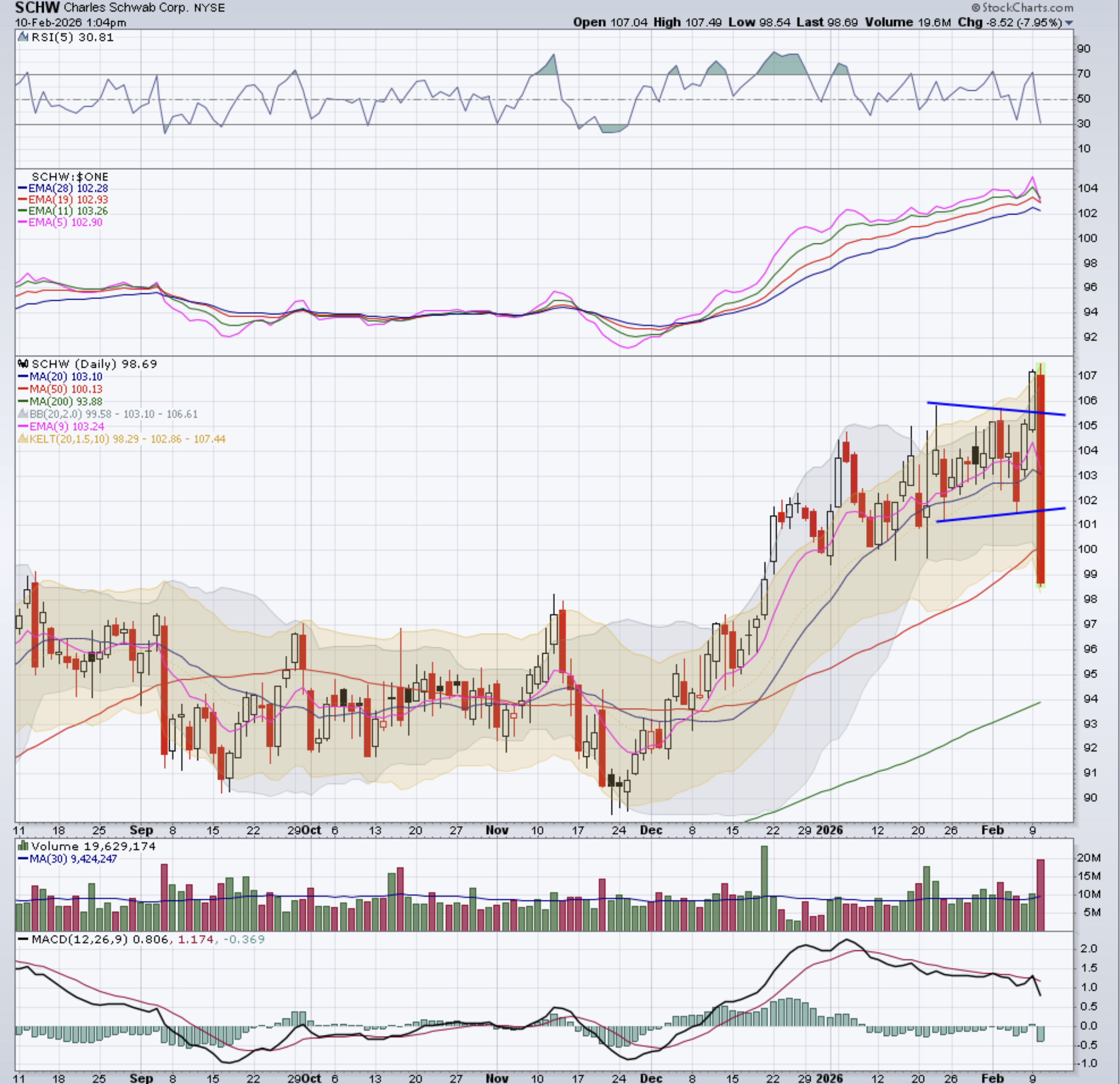 On one hand they say AI is an overbuilt bubble with no use cases, then on the other they say AI will wipe out any incumbent software or service. The last couple of days we've watched SPGI (financial reporting), MRSH (insurance), SCHW (finance), and of course the months of software beatings (NOW) due to AI fears. Simply crazy moves