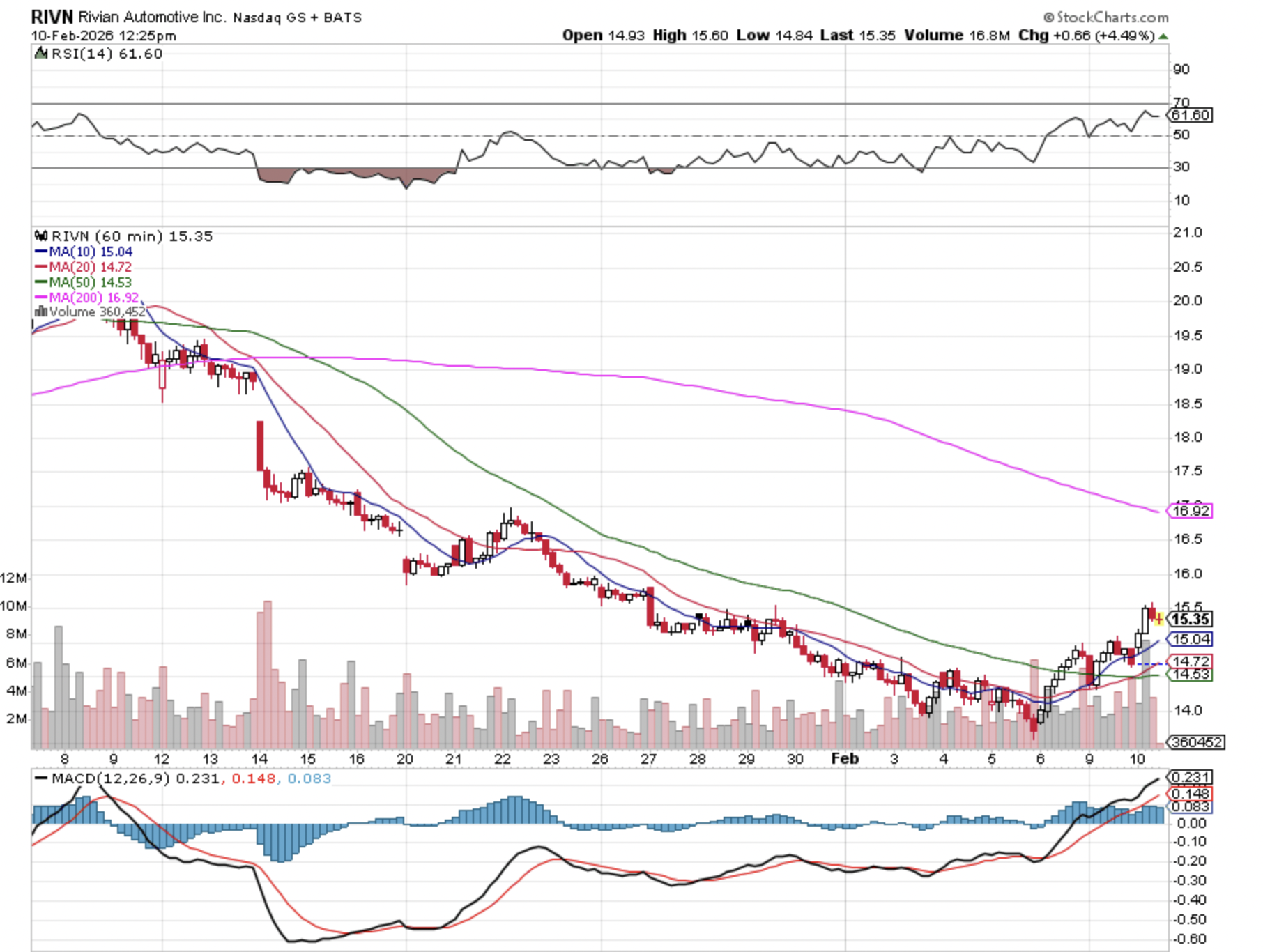 RIVN breaking out of a wedge with MACD divergence, 60 minutes chart