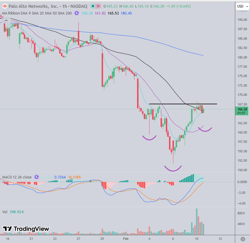 PANW 60min chart looks interesting. I'm a little cautious, though, because the 9ema on the daily is right where the neckline is, and this is the first test of the 9ema since the swoon last week.